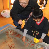 また、ホールの特設会場には、「射的屋さん」に、「金魚すくい屋さん」、「くじ屋さん」、「おもちゃ屋さん」などのお店屋さんが展開され、落花生のお豆を通貨に、ご家族の方と一緒に、お買い物やゲームを楽しみます。